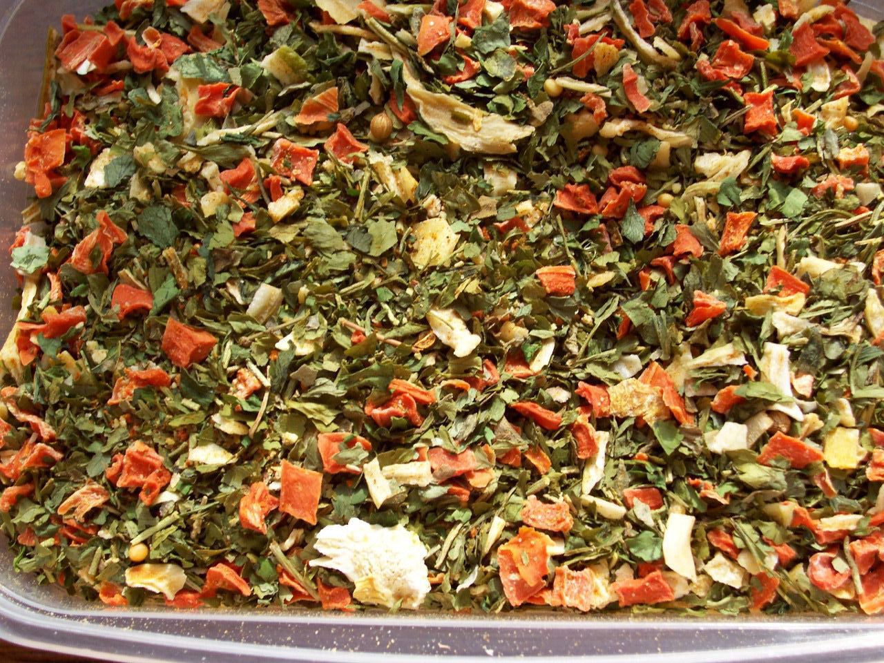 Composition : sel, oignon, carotte, persil, romarin, basilic, poivre du Sichuan, ail, coriandre feuille, céleri, laurier.
